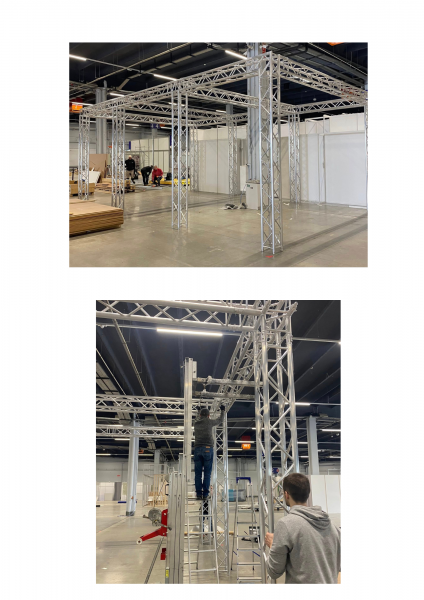 ZADASZENIE JEDNOSPADOWE – posiadamy zadaszenie zaprojektowane na średniej wielkości imprezy plenerowe, można je rozłożyć w bardzo krótkim czasie. Całość wykonana jest w oparciu o kratownice QUADROSYSTEM 290. Poszycie dachu wykonane jest z materiału PCV, siatki boczne wykonane