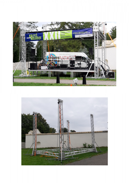 W naszej ofercie znajdują się podesty sceniczne o wymiarach 1000 x 2000 x 100 mm. Ich konstrukcja pozwala na rozbudowę wzdłuż i wszerz w zależności od potrzeb, budowę sceny o różnorodnych kształtach, wielopoziomowej oraz ustawienie na dowolnej wysokości. Uzupełnieniem sceny jest zadaszenie, które ochroni uczestników imprezy plenerowej przed nadmiernym słońcem lub deszczem, a także kratownice, które stanowią nośniki dla oświetlenia oraz nagłośnienia.