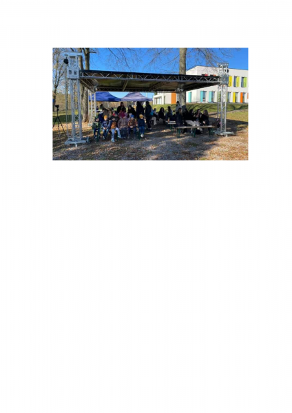 z materiału przepuszczającego powietrze zabezpieczające scenę przed wpływami czynników atmosferycznych, tj. np. deszcz. Poszycie dachu oraz siatki boczne posiadają atesty trudnopalności.