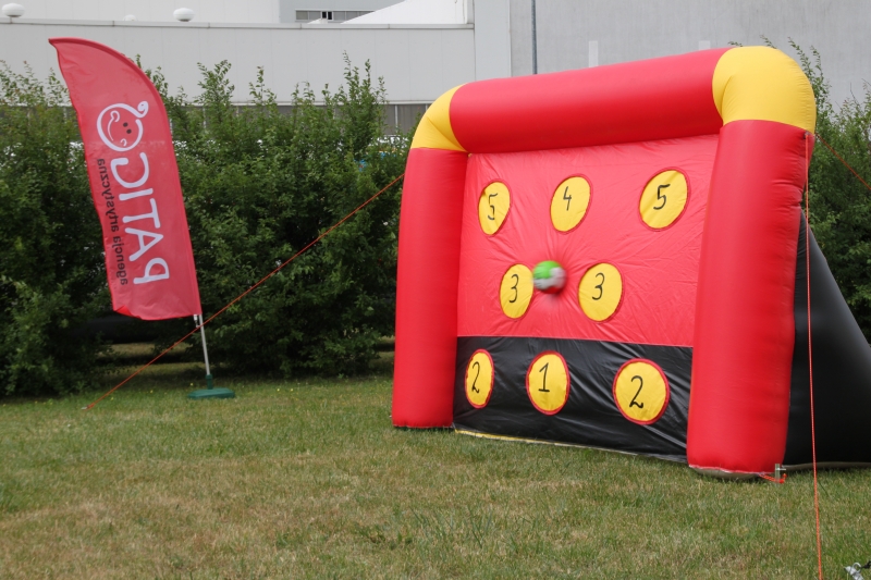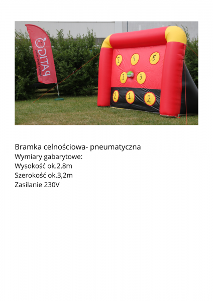 Bramka celnościowa pneumatyczna to dynamiczna i angażująca atrakcja, która doskonale sprawdza się podczas eventów plenerowych, pikników rodzinnych, imprez sportowych oraz wydarzeń firmowych. Kolorowa, dmuchana konstrukcja z ponumerowanymi polami zachęca uczestników do sprawdzania swojej celności, refleksu i koordynacji ruchowej w formie lekkiej rywalizacji.