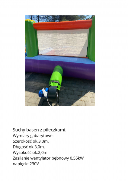 SUCHY BASEN Z PIŁECZKAMI – urządzenie atestowane, wymiary gabarytowe: dł. 3,0m, szer. 3,0m, wys. 2,0m. Zasilanie powietrzem, wentylator bębnowy z silnikiem 0,55kW. W zestawie kolorowe, plastikowe piłeczki.