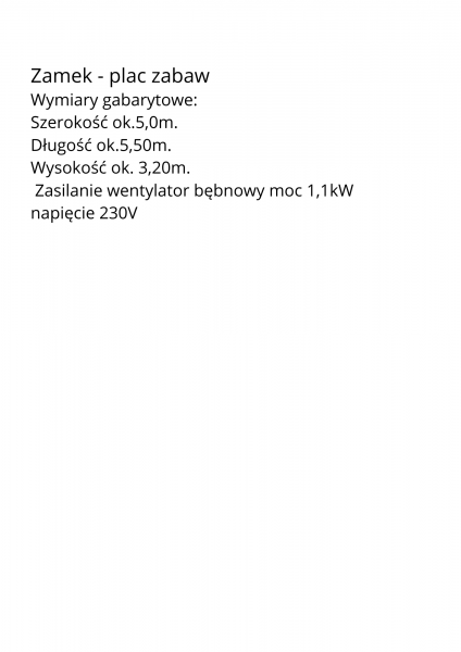 ZAMEK PNEUMATYCZNY MAŁPA – urządzenie atestowane, wymiary gabarytowe: dł. 5,0m, szer. 4,5m, wys. 4,5m, poduszka o grubości 0,7m. Urządzenie wielokolorowe zasilane powietrzem, wentylator bębnowy z silnikiem 0,55kW.